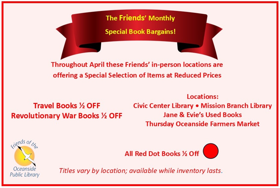 Some donated items become part of the Library’s collection, while others are sold at Jane and Evie’s Used Books; at the Friends’ bookstores at the Civic Center and Mission Branch Library; at the Friends’ Amazon bookstore; and at Oceanside’s Thursday Farmers Market. These sales are a crucial source of support for the Library’s special events, programs for all ages and the purchase of new books and other materials.